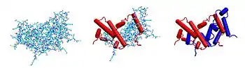 The biologically active dimer is formed by anti-parallel inter-locking of the two monomers as shown below. In the cartoon model, one monomer is shown in red, the other in blue.