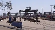 It is also common in North America to transport semi-trailers on railway flatcars or spine cars, an arrangement called "piggyback" or TOFC (trailer on flatcar) to distinguish it from container on flatcar (COFC). Some flatcars are designed with collapsible trailer hitches so they can be used for trailer or container service.[13] Such designs allow trailers to be rolled on from one end, though lifting trailers on and off flatcars by specialized loaders is more common. TOFC terminals typically have large areas for storing trailers pending loading or pickup.[14]