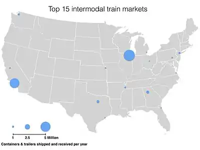 In the U.S., starting in the 1960s, the use of containers increased steadily. Rail intermodal traffic tripled between 1980 and 2002, according to the Association of American Railroads (AAR), from 3.1 million trailers and containers to 9.3 million. Large investments were made in intermodal freight projects. An example was the US$740 million Port of Oakland intermodal rail facility begun in the late 1980s.[2][3]