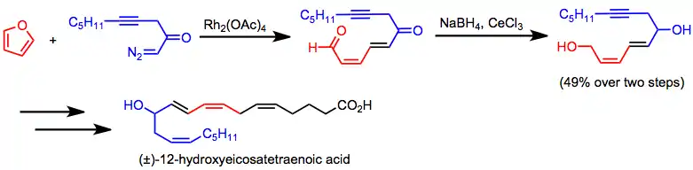 Enantioselective intermolecular cyclopropanation has been applied to the synthesis of chiral cyclopropane antibiotics, such as cilastatin.[23] (12) Tandem cyclopropanation/fragmentation is a key step in the synthesis of 12-hydroxyeicosatetraenoic acid.[24]