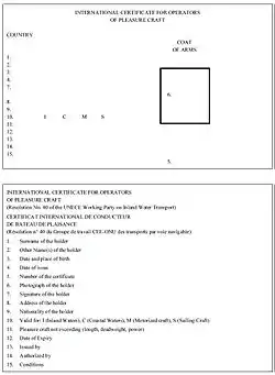 - "International Certificate (International Card) Concerning the Competence of Pleasure Craft Operators - Resolution No. 14, revised" (PDF). Compendium of resolutions of the Principal Working Party on Inland Water Transport, TRANS/SC.3/131. United Nations Economic Commission for Europe, Inland Transport Committee, Working Party on Inland Water Transport. 29 January 1979. p. 27. Retrieved 2013-11-29.