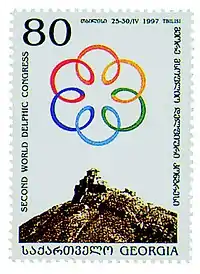 Official stamp of the II Delphic World Congress 1997 in Tbilisi. The stamp shows the emblem of the International Delphic Movement and the Georgian monastery Jvari
