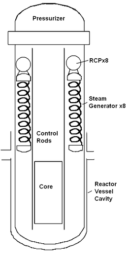 - Fewer penetrations to the pressure vessel - by having the control rods and all drive mechanisms contained within the vessel, the need for dozens of small penetrations is eliminated, which are extremely costly. The only penetrations used are for the incoming and outgoing secondary coolant and for emergency safety systems.