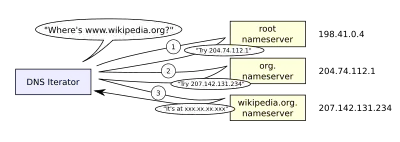 A DNS resolver consults three name servers to resolve the domain name user-visible "www.wikipedia.org" to determine the IPV4 Address 207.142.131.234