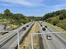 On April 29, 2018, the turnpike commission implemented all-electronic tolling at the Keyser Avenue and Clarks Summit toll plazas.[14][15] All-electronic tolling was originally scheduled to be implemented on the entire length of the Northeast Extension in the later part of 2021.[16] However, in March 2020 the switch was made early as a result of the COVID-19 pandemic.[17] The all-electronic tolling system on the turnpike will initially use existing toll booths at exits, along with existing equipment at all-electronic tolling interchanges, until mainline toll gantries between interchanges are constructed. Mainline toll gantries are planned to begin operation by 2022.[16]