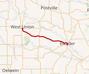 Iowa Highway 56 (Iowa 56) is a state highway that runs from west to east in northeastern Iowa. It begins at Iowa Highway 150 in West Union and ends at Iowa Highway 13 south of Elkader. As a largely rural route, Iowa 56 passes through the farmland of Fayette and Clayton counties. Through Elkader and to its eastern end, the highway runs parallel to the Turkey River.