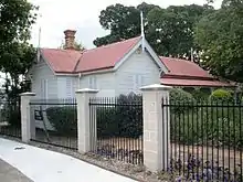 Later in 1892, a gymnasium, play shed, stables, fences, roads and trees were added to the school grounds. Amongst the trees planted at this time were those lining the main driveway, forming an avenue consisting of weeping figs, Moreton Bay figs and camphor laurels. The gatekeeper's lodge was also built in 1892 by Worely and Whitehead for £153 to the design of George Brockwell Gill. The Trustees of the School demanded that the kitchen, as well as the living room, of the lodge have a view of the school's gate with the idea that the caretaker's wife would attend the gate while in the kitchen.[1]
