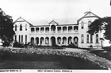 In 1887 a committee was formed to raise funds for the establishment of a Girls Grammar School and in 1890 the land for the current site of the school was granted by the Trustees of Queen's Park in Ipswich. In the same year, George Brockwell Gill had been appointed architect and was contracted to design a school building for a cost of £3500. Tenders for construction were called in The Queensland Times on 21 Jan 1891 and contractors Worley and Whitehead were accepted with a tender of £3893. The foundation stone of the school was laid on 10 March 1891 by Acting Governor, Sir Arthur Hunter Palmer, K.C.M.G.[1] The architect of the original building, George Brockwell Gill, designed many of the grand residences and public buildings in Ipswich from the 1880s to the 1930s. Some of his works include "Brynhyfryd" for Lewis Thomas (1889/90), St Paul's Rectory (1895), the Ipswich Club House (1916), Ipswich Technical College (1901), and supervision of the construction of the Walter Burley Griffin Incinerator in 1936. Gill emigrated from London and settled in Ipswich in 1886 where he commenced work as an architect for the firm of Samuel Shenton. Gill took over Shenton's practice in 1889 when Shenton retired. Gill had been elected Associate of the Queensland Institute of Architects in 1904 and Fellow by 1913. He was its Vice-President in 1914-16 and President in 1918-19. Gill was also a member of the Board of Trustees for the school and on his retirement in 1948 he was the Chairman of the Board of Trustees.[1]