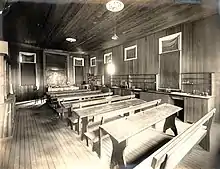 Terminating the tree lined avenue are the Assembly Hall and the Administration building. The Administration building was the first building constructed on the site. It is a classical two storey rendered brick building, designed by Brockwell Gill, that was constructed in stages from 1892. The first stage consisted of the central portion with a transverse gabled wing to the left hand end. Another transverse gabled wing was added at the right hand end in 1901, completing the symmetry of the building. The gabled ends have pilasters rising up through two storeys and terminating in three semi-circular arches above the upper storey windows. The date of construction of each wing is inscribed in raised lettering below each central upper window. The central portion of the facade consists of a ground floor arcaded verandah with a central semi-circular arch leading to the central entrance door. This semi-circular arch is repeated on the upper verandah and is surmounted by a central gabled roof. Timber finials and decorative timber fretwork are at the end of each gable.[1] The internal walls of the Administration building consist mainly of a painted rendered finish up to the dado line with painted brick above. The majority of the interior timber joinery is intact. A decorative roof lantern lights the fine timber stairwell in the 1901 wing. The 1892 wing also contains a more simply detailed timber stair. The upper room in this wing features heavy timber roof trusses with a diagonally boarded ceiling lined on the rake and timber honour boards dating back to the formation of the school.[1] The rear of the Administration building consists of several wings built around a central courtyard. The rear wings were constructed in stages, beginning with a single storey and resulting in two storey wings to three sides of the courtyard. These wings are of brick and timber construction, with narrow verandahs on both sides of a central room core. The verandahs are simply detailed with timber balustrades with a cross pattern and curved timber brackets.[1]