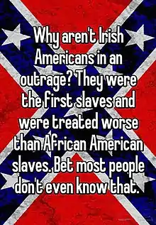 The Irish slaves myth is a pseudohistorical narrative that conflates the penal transportation and indentured servitude of Irish people during the 17th and 18th centuries, with the hereditary chattel slavery experienced by the forebears of the African diaspora. Some white nationalists, and others who want to minimize the effects of hereditary chattel slavery on Africans and their descendants, have used this false equivalence to deny racism against African Americans[1] or claim that African Americans are too vocal in seeking justice for historical grievances.[2] It also can hide the facts around Irish involvement in the transatlantic slave trade.[3] The myth has been in circulation since at least the 1990s and has been disseminated in online memes and social media debates.[4] According to historians Jerome S. Handler and Matthew C. Reilly, "it is misleading, if not erroneous, to apply the term 'slave' to Irish and other indentured servants in early Barbados".[5] In 2016, academics and Irish historians wrote to condemn the myth.[6]