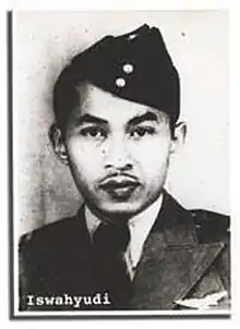 During the Japanese occupation, the best graduates of the military academy were evacuated to Europe and Australia by the Dutch to undergo further education and missions. However, Iswahyudi, who was evacuated to Australia, felt dissatisfied and returned to Dutch East Indies by rubber boat.[3] After the Proclamation of Independence in 1945, Iswahyudi helped the people of Surabaya to defend the city. He secured airplanes and Japanese weapons, which had been taken to Tanjung Perak.[4] Afterward, Iswahyudi joined Tentara Keamanan Rakyat Jawatan Penerbangan (Flight Service of People's Security Forces; modern day Indonesian Air Force) in Yogyakarta.[4][5]