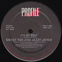 "It's My Beat" is the debut single as lead artist of American rapper Sweet Tee and DJ Jazzy Joyce, released in 1986 via Profile Records. In 1988 it was included on Sweet Tee's debut album It's Tee Time. Produced by Hurby "Luv Bug" Azor, who also has writing credits for the song alongside Sweet Tee,[1] the single was later released in the UK through Champion Records.