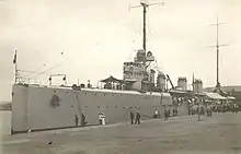 Quarto was modified in 1926–1927 to handle a Macchi M.18 seaplane.[1] In the early 1930s, Quarto was sent to East Asian waters, where she replaced the cruiser Libia. Quarto's stay there was short lived, as she was transferred to Africa to support the Second Italo-Ethiopian War in 1935–1936.[9] Three of her 76 mm guns were replaced with 13.2 mm (0.52 in) machine guns in 1936.[1] She thereafter served as the flagship of Rear Admiral Alberto di Moriondo, the commander of Italian warships operating off Spain with the non-intervention patrols during the Spanish Civil War.[10] On 24 May 1937, Spanish Republican bombers nearly hit the ship while she was moored in Palma, Majorca.[11]