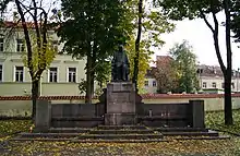 Montwiłł also financed the creation of a Polish school in Vilnius (1907), a city hall in Panevėžys; built already after his death, and the Polish Theatre in Vilnius (in modern times converted to Russian Dramatic Theatre of Lithuania). He died in 1911, and was buried at the Rossa cemetery (Lithuanian: Rasos). His tomb, designed by Zygmunt Otto, was decorated with a sculpture of an angel. Although vandalized in recent times, the tomb remains there. In 1935, a monument to Montwiłł was erected in front of the Franciscan Church. A monument in his honour was built in the square, located in the former Franciscan cemetery in the Trakai Street of Vilnius.