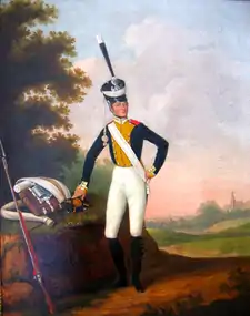 He was born in Žiežmariai on 6 November 1789 as son of Teodor Jozef Łukaszewicz (1747–1805), noble and owner of the village council and administrator of several towns in the property of Władysław Franciszek Jabłonowski in Czeszewo, and Katarzyna Zofia Marianna Łukaszewicz born Baranowska (1765–1843). He was brother of Józef Łukaszewicz (1799–1873), historian, publicist, librarian and publisher.[1] He studied first in Vilnius as pupil of Jan Rustem. After the Napoleonic army entered Lithuania in 1812 he decided to join Napoleon's elite honor guard, made up of noble youth, becoming a soldier of the third Lithuanian regiment under the command of General Jan Konopka. As a result of the battle of Słonim, General Konopka and some of his soldiers were taken prisoner. The soldiers from the broken regiment, including Józefat Łukaszewicz with the remnants of the Great Napoleonic Army, returned to Saxony in the retreat.[2] The sick Józefat was cared for by an uncle Jan Baranowski, who lived in Warsaw, a well-known violin maker and manufacturer of musical instruments. In the years 1814 - 1818 in Warsaw he studied with Józef Kosiński, Antoni Brodowski and Antoni Blank at the Department of Fine Arts at Warsaw University becoming a great battle painter who was able to describe in detail in his paintings weapons and uniforms of the army of the Kingdom of Congress Poland.[3] He also painted landscapes, religious subjects, interiors and above all portraits and portrait miniatures. At the Warsaw Exhibitions of Fine Arts in the years 1819, 1821 and 1825, Józefat Łukaszewicz exhibited his paintings, for which in 1819 was awarded a gold medal, and in 1825 he was awarded together with Fryderyk Chopin by Tsar Alexander I of Russia with a diamond ring. From 1819 to 1830, he was court painter to the Count Konstanty Zamoyski (1799–1866), Polish aristocrat, Chamberlain of the Emperor of the Russian Empire, Nicholas I of Russia and statesman of the Congress Poland. He worked also for different members of the Russian Imperial Court such as Grand Duke Konstantin Pavlovich of Russia and Joanna Grudzińska his second wife, for them he created a series of paintings of soldiers with true and photographic accuracy taking into account all the details of uniforms and equipment. He died in Warsaw on 3 January 1850 and was buried in Powązki Cemetery. His works are in numerous churches ed museums, including the Lviv National Museum, Polish Army Museum, National Museum, Warsaw, National Museum, Szczecin, Belweder and Russian Museum in Saint Petersburg.[4]