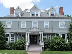 The J. A. Wood House is a historic house located at 3 Sacramento Street in Cambridge, Massachusetts. The large 2+1⁄2-story wood-frame Colonial Revival house was built in 1888 for James Wood, a lumber dealer. The house was designed by Hartwell and Richardson and originally faced Massachusetts Avenue. In 1925 it was rotated ninety degrees to face Sacramento Street, in order to make way for commercial development. The house is a wide five bays across, with a hip roof that is pierced by three dormers, and a left-side ell that is set back. The front entry is sheltered by a gable-front portico, which is supported by a series of paired Tuscan columns on each side.[2]