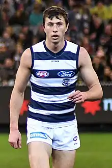 Jack Henry (born 29 August 1998) is a professional Australian rules footballer playing for the Geelong Football Club in the Australian Football League (AFL). He was drafted by Geelong with their first selection and sixteenth overall in the 2016 rookie draft.[1] He made his debut in the one point loss to Hawthorn at the Melbourne Cricket Ground in round two of the 2018 season.[2] In his sixth match, he recorded eighteen disposals, eleven marks (including five intercept marks), and three tackles in the sixty-one point win against Greater Western Sydney in round seven to earn the round nomination for the 2018 AFL Rising Star. Henry moved forward in the second half of the 2018 AFL season and kicked 8 goals in a handful of games in the forward line, including a three-goal haul against Brisbane at GMHBA Stadium.[3] Henry is of Lebanese and Kiwi descent.