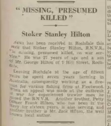 - "Missing Presumed Killed". Rochdale Observer. 8 February 1941.