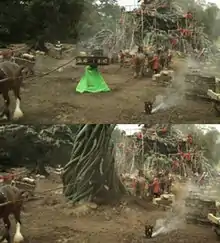 The film's special effects were completed by seven different visual effects houses: Digital Domain, Giant Studios, The Third Floor, MPC, Soho VFX, Rodeo FX and Hatch Productions.[32] Creating the giants took four main steps. The first step was Pre-Capture, in which performance capture was used to capture the actor's facial and body movements and render them in a real-time virtual environment. The second step took place during principal photography, where Simulcam technology was used to help the human characters virtually interact with the giants that were rendered earlier in Pre-Capture. The third step was Post-Capture, a second performance capture shoot to adjust giants' movements to seamlessly fit the live-action performances. The final step involved putting the finishing touches on the giant's animation, skin, hair and clothing, and composition in the shots.[32] Creating the beanstalk involved two main requirements: set extension for shots of the actors interacting with the beanstalk, which were shot against a bluescreen, and complete CG renderings for shots of the beanstalk growing and extending from Earth into the world of the giants.[32]