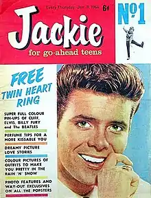 ![]() The cover of Jackie #1 (11 January 1964), offering a free "twin heart ring." | |