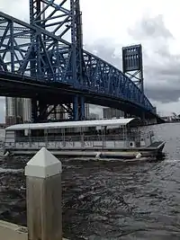 Water taxi service in Downtown Jacksonville began in 1987, with the opening of the Jacksonville Landing, a riverfront shopping and entertainment center.[1] In the early years a variety of companies ran water taxis out of the Landing, with the City of Jacksonville allowing any operator who passed the minimum U.S. Coast Guard safety regulations to start a water taxi business. This led to fierce competition during peak times and inconsistent service, with captains ignoring city regulations on routes and use of the stops to fight each other for customers. Eventually, the Jacksonville City Council Waterways Commission stepped to demand improved service. Ultimately, in 2002, the City of Jacksonville adopted new regulations governing the Jacksonville Water Taxi, awarding a contract to a single operator who adheres to a consistent route and schedule.[2][3]