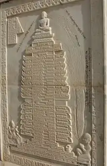 Ayagapata is a type of votive tablet used in Jainism for donation and worship in the early centuries. These tablets are decorated with objects and designs central to Jain worship such as the stupa, dharmacakra and triratna. They present simultaneous trends or image and symbol worship. Numerous such stone tablets were discovered during excavations at ancient Jain sites like Kankali Tila near Mathura in Uttar Pradesh, India. The practice of donating these tablets is documented from first century BCE to third century CE.[258][259] Samavasarana, a preaching hall of tirthankaras with various beings concentrically placed, is an important theme of Jain art.[260]