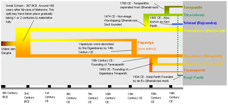 Traditionally, the original doctrine of Jainism was contained in scriptures called Purva. There were fourteen Purva. These are believed to have originated from Rishabhanatha, the first tirthankara.[1] There was a twelve-year famine around fourth century BCE.[2] At that time, Chandragupta Maurya was the ruler of Magadha and Bhadrabahu was the head of Jain community. Bhadrabahu went south to Karnataka with his adherents and Sthulabhadra, another Jain leader remained behind. During this time the knowledge of the doctrine was getting lost. A council was formed at Pataliputra where eleven scriptures called Angas were compiled and the remnant of fourteen purvas were written down in 12th Anga, Ditthivaya by the adherents of Sthulbhadra. When followers of Bhadrabahu returned, there was a dispute between them regarding the authenticity of the Angas. Also, those who stayed at Magadha started wearing white clothes which was unacceptable to the other who remain naked. This is how the Digambara and Svetambara sect came about. The Digambara being the naked ones where as Svetambara being the white clothed. According to Digambara, the purvas and the angas were lost. In course of time, the cannons of Svetambara were also getting lost.[3] About 980 to 993 years after the Nirvana of Mahavira, a Vallabhi council was held at Vallabhi (now in Gujarat). This was headed by Devardhi Ksamashramana.[3][4] It was found that the 12th Anga, the Ditthivaya, was lost too. The other Angas were written down.[3] This is a traditional account of schism.[5] According to Svetambara, there were eight schisms (Nihvana).[6]