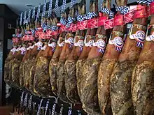 Jamón ibérico (Spanish: [xaˈmon iˈβeɾiko]; Portuguese: presunto ibérico [pɾɨˈzũtu iˈβɛɾiku]), "Iberian ham" is a variety of jamón or presunto, a type of cured leg of pork produced in Spain and, to a lesser extent, Portugal.