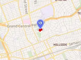 The current Jamaica High School campus opened in 1927,[2] and is located on a large tract between 168th Street to the east and Chapin Partway to the west in the Jamaica Hills section of Jamaica, across from Captain Tilly Park.[4] The school faces towards Gothic Drive at the south end of the campus. 84th Avenue marks the north end of the site, one block south of the Grand Central Parkway.[2][5][6] The property is 13 acres (5.3 ha) in size.[7][8] This large expansive campus is unconventional for a New York City school.[2] Across 84th Avenue is Thomas A. Edison High School, a vocational school. Across to the south and west is Captain Tilly Park.[2][5][6] The campus occupies a hilltop location with commanding views on Gothic Drive.[9] When the building first opened, views were available across to the bodies of water surrounding Long Island: the Long Island Sound, East River, and Atlantic Ocean.[10] A large lawn separates the school building from Gothic Drive, with a stone stairway and pathway leading up from the street to the school.[2][11][12] An iron fence encircles the entire property.[2]