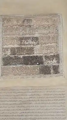 There was name plate engraved on stone located at the top of entrance gate facing inside of Mosque. This plate got damaged with time and, one piece of it was found during renovation work. When enquired with archeological authorities few more pieces of the plate were recovered. With further research the details about missing piece of the name plates were collected, replica of missing part were made and, complete name plate was reinstalled at its original location by Dawoodi Bohra Spiritual Leader, Dr. Syedna Mohammad Burhanuddin.(as per photo placed). Few pieces in the name plate which looks old and having dark color are the original ones. Fourth line ending part and beginning of fifth line of the name plate mention the name of Imam "Haakim amar-i-llah" in Kufi Arabic scripts.