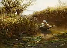 Aumonier exhibited for the first time at the Royal Academy in 1871, but continued his work on calico until after 1873, when Sir Newton Mappin purchased a picture shown by him at the Royal Academy, An English Cottage; Home. He concentrated himself on peaceful English countrysides, specially with autumn tints or in the late afternoon. His pictures included When the Tide is Out, The Silver Lining of the Cloud (both in the Royal Academy of 1895), In the Fen Country, The Old Sussex Farmstead, and Sunday Evening. Sheep Washing was in the Chantrey bequest collection at the Tate Gallery, which also owned his Black Mountains.[1] Aumonier exhibited at the third annual exhibition held at the Carnegie Institute in Pittsburgh in 1898/9 his landscape "A Sussex Hayfield".