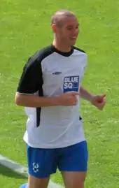 He scored his first goals of 2007–08 with a hat-trick in a 4–0 victory over Exeter City on 1 September 2007.[34] After two matches without scoring, he scored a second hat-trick for Kidderminster in a 5–4 defeat to Ebbsfleet United.[34] He was substituted at half-time in Kidderminster's 2–1 defeat to Histon in October 2007,[35] after picking up a hamstring injury.[36] He made his return in a 2–0 victory over Ware in the FA Cup in November 2007, scoring the first goal with a shot from 18 yards.[34][37] He was sent off in a 2–0 defeat against Oxford United on 24 November 2007 for elbowing James Clarke,[38] and after having an appeal rejected, was given a three-match suspension.[39] He made his return in a 2–1 away win over Hinckley United in the Conference League Cup on 22 December 2007.[34]