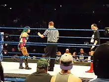 After his storyline with Styles and Ambrose ended, Ellsworth allied himself with Carmella.[34] On the January 3, 2017 episode of SmackDown, Ellsworth started accompanying Carmella to the ring for her matches, helping her win.[35] Ellsworth entered the 2017 Royal Rumble match at number 11, but was eliminated by Dean Ambrose and Braun Strowman after only 15 seconds.[36] Ellsworth made his WrestleMania debut on April 2 at WrestleMania 33, managing Carmella in the six-pack challenge for the SmackDown Women's Championship which was won by Naomi.[37] On April 25, Carmella and Ellsworth formed an alliance with Natalya and the returning Tamina.[38] On the May 16 episode of SmackDown, Carmella scored a victory over Naomi in a non-title match via distraction from Ellsworth.[39] Dubbed The Welcoming Committee, the team of Carmella, Natalya and Tamina managed by Ellsworth defeated Flair, Lynch and Naomi in a six-woman tag team match on May 21 at Backlash.[40] On June 18 at Money In the Bank, he helped Carmella win the first ever Women's Money in the Bank ladder match by pushing Becky Lynch off the ladder and dropping the briefcase to Carmella.[41]