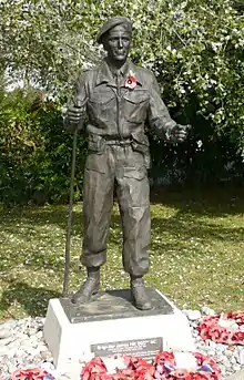 For the rest of its time in Normandy the division acted in an infantry role. From 7 June until 16 August, it first consolidated and then expanded its bridgehead.[43] The 3rd Parachute Brigade was responsible for a section of front around the Chateau Saint Come and a nearby manor, with the latter being used as the brigade's primary defensive position.[42] The brigade was positioned next to the 1st Special Service Brigade, and from 7 June onwards German pressure rapidly increased against both brigade's positions, with a number of attacks being repelled between then and 10 June.[44] On 10 June the decision was taken to expand the bridgehead to the east of the River Orne, with the 6th Airborne Division tasked with achieving this; however, it was deemed not to be strong enough, and the 5th Battalion, Black Watch was placed under the 3rd Parachute Brigade's command; the battalion launched an attack on the town of Breville on 11 June, but was met with extremely heavy resistance and was repulsed after suffering a number of casualties. The next day 3rd Parachute Brigade's entire front was subjected to fierce artillery bombardment and assaults by German tanks and infantry, with the Germans particularly focusing on the positions held by 9th Parachute Battalion.[45][46] Both the 9th Parachute Battalion and the remnants of the 5th Black Watch defended the Chateau Saint Come but were gradually forced to retreat. Lieutenant Colonel Otway informed brigade headquarters, some 400 metres (1,300 ft) away, that his battalion would be unable to hold its ground for much longer; upon hearing this message, Brigadier Hill gathered together forty paratroopers from the 1st Canadian Parachute Battalion and led a counter-attack that forced the German troops to withdraw.[47][48]