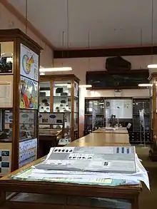 The Museum is now housed in one room, formerly the Geographical Museum.[4] The Museum contains specimens of rocks, minerals and fossils, which primarily serve as an educational resource for the students and staff of NUI Galway, but also primary and secondary school children.[7] There are approximately 5000 fossils and 3000 rocks and minerals within the collections.[8] The collections are of particular interest to the study of Irish geology.[6] Much like the Natural History Museum in Dublin, the gallery is in the Victorian cabinet style, a "museum of a museum".[5] The collections were intended to be representative of international geology, with examples from all around the world. The palaeontological collections include a plesiosaur from Lyme Regis, a German ichthyosaur, and Kiltorcan Devonian flora from County Kilkenny. More recent acquisitions include the Dave McDougall collection, reflecting the current focus on collecting local specimens.[3]