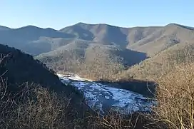 The James River Gorge is a water gap created by the James River in Central Virginia. The Gorge is 2,433 feet (742 m)[1] deep as measured from Highcock Knob 3,073 feet (937 m)[1] to the James River 640 feet (200 m)[1] and is approximately 9.3 miles (15.0 km)[2] long. The James River forms in western Virginia near the border of West Virginia and initially flows south through the ridge and valley province of the Allegheny Mountains, turning northeast when it comes to the western edge of the Blue Ridge Mountains near Buchanan, Virginia. From Buchanan the river flows along the base of the Blue Ridge Mountains until it joins the Maury River near the town of Glasgow and then it turns southeast and begins its descent over the Balcony Falls rapids and through the James River Gorge. The rocks of the gorge are metamorphic in nature with the oldest exposed outcrops being from the Proterozoic Era. [2] To the south of the river the peaks of the James River Face Wilderness dominate and to the north the peaks of Big Rocky Row and Little Rocky Row Mountains form a dramatic backdrop to the river far below. Multiple trails, including the Appalachian Trail go through the gorge and provide spectacular vistas of the scenery both at river level and from the peaks to the north and the south.[3]