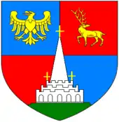 - Arms as depicted in a 1794 stained glass image in Shute Church of the arms of George Templer of Shapwick. These differ in several details from the official grant of 1765 registered in the College of Arms: Quarterly azure and gules, on a mount in base vert the perspective of an antique temple argent of three stories, each embattled; from the second battlement two steeples, [sic] and from the top, one, each ending in a cross sable [sic] on the pinnacle; in the first quarter an eagle displayed; in the second a stag trippant regardant or.[1]