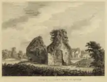 A stone cross over a small gate (constructed by Murtagh O'Dowd, local blacksmith), outside the old town gate, leads to the remains of a Franciscan friary of the Friars Minor. The Franciscan friary of the Friars Minor was not founded until the occupation of Jamestown in 1642 by the O'Rourke Clan. A synod held here in 1650 repudiated The 1st Marquess of Ormonde, the former Lord Lieutenant of Ireland, and excommunicated his followers. In 1713, an elderly Father Connor Reynolds "of Jamestown in the county of Leitrim" exiled in Spain since 1681, was captured hiding in a trunk on a fishing boat arriving at Dungarvan port and imprisoned at Waterford gaol.[3]