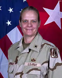 Janis Leigh Karpinski (née Beam, born May 25, 1953) is a retired career officer in the United States Army Reserve. She is notable for having commanded the forces that operated Abu Ghraib and other prisons in Iraq in 2003 and 2004, at the time of the scandal related to torture and prisoner abuse. She commanded three prisons in Iraq and the forces that ran them. Her education includes a Bachelor of Arts degree in English and secondary education from Kean College, a Master of Arts degree in aviation management from Embry-Riddle Aeronautical University, and a Master of Arts in strategic studies from the United States Army War College.