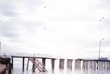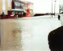 The stronger northeast quadrant moved directly over Delaware for one tidal cycle, producing strong east-northeasterly wind gusts that peaked at 83 mph (134 km/h) at a station along the Indian River.[2][9] The highest tides and flooding along the Delaware coastline were between Bowers and Prime Hook National Wildlife Refuge, where high waves built momentum from the Atlantic Ocean through the Delaware Bay.[2] In Bowers, the tide reached 8.76 ft (2.67 m) along the Murderkill River; the reading was only 2 in (51 mm) less than the record set during the Ash Wednesday Storm of 1962. The high tides flooded marsh vegetation in the town. In Lewes, the highest tide was 7.40 ft (2.26 m), which was the second highest on record; only the 1962 storm was higher, which produced a tide of 8.05 ft (2.45 m). The storm caused significant flooding in Dewey Beach,[5] where a high tide of 9.02 ft (2.75 m) marked the second-highest tide in Delaware history.[12] The saltwater contaminated the town's water supply.[13] The ocean washed over dunes in several locations along Delaware Bay, including in Fowler Beach where flooding reached 20 ft (6.1 m) inland. Near Mispillion Light, the high tides damaged the marina and several nearby buildings.[2] The high tides flooded marshes and low-lying areas throughout the state, which briefly closed portions of state highways 54, 26, and 1.[2] High tides destroyed 11 blocks of the boardwalk in Rehoboth Beach and half of the promenade at Bethany Beach.[6][13] At nearby South Bethany, high waves destroyed three houses.[7] Along the coast, the storm destroyed 15 houses and damaged 500 others, amounting to over $5 million (1992 USD) in property damage.[9] In addition to the strong winds and high tides, the nor'easter produced light rainfall that did not cause any flooding. The highest total in the state was 1.06 in (27 mm) in Georgetown.[2] Due to the damage, Kent and Sussex counties were declared federal disaster areas on February 6; this allocated federal funding for repairing storm damage.[14] Then-governor Michael Castle activated the state's National Guard to assist clearing highways and prevent civilian access to damaged areas.[7] Due to storm damage, access to Dewey Beach and Rehoboth Beach were restricted to residents.[13]