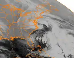 On January 2, a small low pressure area developed along the East Coast of the United States. Due to its small size, the storm was poorly forecast.[1] A strong upper-level low moving through Georgia and South Carolina caused the low to move to the west, perpendicular to the Mid-Atlantic coast.[2] As it did so, the combination of warm air from the south and strong upper-level winds caused the low to rapidly intensify.[3] On January 4, a buoy reported a minimum barometric pressure of 993 mb (29.3 inHg), and maximum sustained winds of about 45 mph (72 km/h).[1] The system developed tropical characteristics, including the development of an eye feature in the center of the storm. Between 0500 and 0700 UTC on January 4, the storm moved ashore along the Eastern Shore of Virginia,[2] about 25 mi (40 km) south of Ocean City, Maryland.[4] It quickly weakened while moving across the Delmarva Peninsula and it emerged into the Chesapeake Bay by 1000 UTC that day. Three hours later, the storm was stalled over northern Virginia. A secondary low pressure area developed within the overall system further out to sea later on January 4.[2]