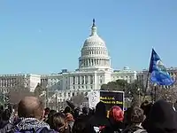 A black bloc, organized by Students for a Democratic Society, and advertised as a "radical youth bloc" on the DC Indymedia site,[2] met at Dupont Circle to begin a feeder march to the main rally site on the National Mall. The march from Dupont Circle to the Mall roughly followed the course of Massachusetts Avenue NW to its intersection with 7th Street NW near the Washington Convention Center. The march then followed 7th Street through Chinatown and the Penn Quarter neighborhood before reaching the Mall. The feeder march continued past the back of the mainstream rally on 7th Street, and onto Maryland Avenue SW, before briefly stopping at 3rd Street, at roughly the center line of the Mall.[3]