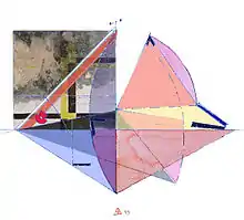 Un carré pour un square, Cube fantôme and Reflet anamorphose,[28] are three pieces according to anamorphosis principle as described by Matilde Marcolli : « If the vector space one starts with is the 3-dimensional space, whose vectors have 3-coordinates v = (x1, x2, x3), then, as long as v is nonzero and a real number λ is also nonzero, the vector v = (x1, x2, x3) and the vector λv = (λx1, λx2, λx3) point along the same straight line and we consider them as being the same point of our projective space. »[29]