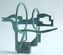 Albert’s Sculptures Bachelard aims to concentrate the surrounding environment in the sculpture. When looking in the Observation Sculpture through its sights (an aperture or circles), the space beyond is (roughly) framed. Combining the different perspectives framed, the little sculpture, usually in bronze, takes shape after the space it is aiming at. An Observation Sculpture proposes a summary of this space concentrated, agglomerated and stuck together in a kind of core, like a geometric model of the site’s character.[26][27]