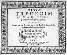 The same collection indicates him at that time as master of the children of the collegiate church of Saint-Quentin.[2] In 1613 Bournonville offered to the chapter of the Cambrai Cathedral a bound collection of his masses (probably the Parisian editions of Pierre I Ballard).[3] He remained in Saint-Quentin until about 1618.[4]