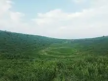 Yongnunioreum (Hangul: 용눈이오름) is located in Jongdal-ri Gujwa-eup Jeju-si.[12] The top of Yongnunioreum is composed of three peaks around the top of north-east direction, and there is an elliptical crater somewhat opened in the east–west direction. Overall, the shape of mountain is a horseshoe-shaped crater that spreads shallowly toward the east slope. At the foot of the west slope, there are a small parasitic volcano with marginated top and two conical parasitic volcanoes, Aloreum, and it is recorded as a complex Oreum, formed with two or more craters along with Yongnunioreum (Hangul: 용눈이오름) and Donurioreum (Hangul: 도너리오름). Especially, a complex volcano made up of various craters is known as an unusual shape.[12] It is said that it is called Oreum because of the shape of Oreum, the figure of the dragons playing, lying and rising in regard to the origin of the place name.[13]