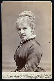 Jennie Lee (c. 1854[1][2] – 3 May 1930) was a Victorian Era English stage actress, singer and dancer whose career was largely entwined with the title role in Jo, a melodrama[3] her husband, John Pringle Burnett,[4] wove around a relatively minor character from the Charles Dickens novel, Bleak House. She made her stage debut in London at an early age and found success in New York and San Francisco not long afterwards. Lee may have first starred in Jo around 1874 during her tenure at San Francisco's California Theatre, but her real success came with the play's London debut on 22 February 1876 at the Globe Theatre in Newcastle Street. Jo ran for many months at the Globe and other London venues before embarking for several seasons on tours of the British Isles, a return to North America, tours of Australia and New Zealand and later revivals in Britain. Reduced circumstances over her final years forced Lee to seek assistance from an actor's pension fund subsidised in part by proceeds from Royal Command Performances.[5][6]