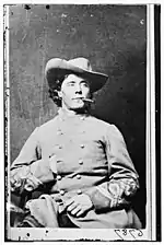 The unit was created by John C. Frémont and named in honor of his wife, rather than of a Colonel Jessie, who was himself a myth.[3] The initial Jessie Scout unit was formed in St. Louis, Missouri early in the war as the plan to develop independent scouts was implemented. The first man to command the scouts was Charles C. Carpenter.[4][5] During insurgency missions the Jessie Scouts wore Confederate uniforms with a white handkerchief over their shoulders to signify their allegiance to friendly troops, and numbered around 58 for much of the war. They were commanded by Major Henry Young from November 1864 until the end of the war.[6] In February 1865 they captured Harry Gilmor and killed Guerilla leader Captain George W Stump.[7]