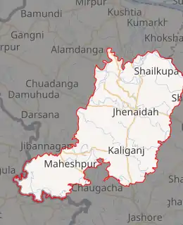 Jhenaidah District (Bengali: ঝিনাইদহ) is a district in southwestern Bangladesh. It is a part of the Khulna Division. It has an area of 1,964.77 km2 (758.60 sq mi).[2] It is bordered by Kushtia District to the north, Jessore District and West Bengal, India to the south, Rajbari District and Magura District to the east, and Chuadanga District and West Bengal, India to the west. The largest city and headquarter of this district is Jhenaidah.[3] At the beginning of the British rule Jhenaidah was a police outpost and was turned into a thana in 1793. The Jhenaidah Sub division was established in 1862 and was turned into a district in 1984.[4]