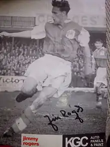 Jimmy Rogers was a livewire opportunist who delighted in telling the world that he was lethal in front of goal – from six inches![2] Rogers was equally effective on the wing or at centre forward. In particular he had an instinct for rebounds that verged on the uncanny. The description "poacher" could have been coined for Rogers. Rogers had fine ball control and bags of determination, he was also firmly of the "if they kick me then I'll kick them back" persuasion and few defenders were able to intimidate him. In summary Jimmy Rogers was a humorous and intelligent person.[2]